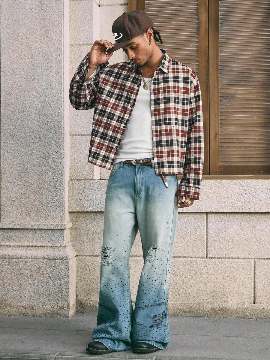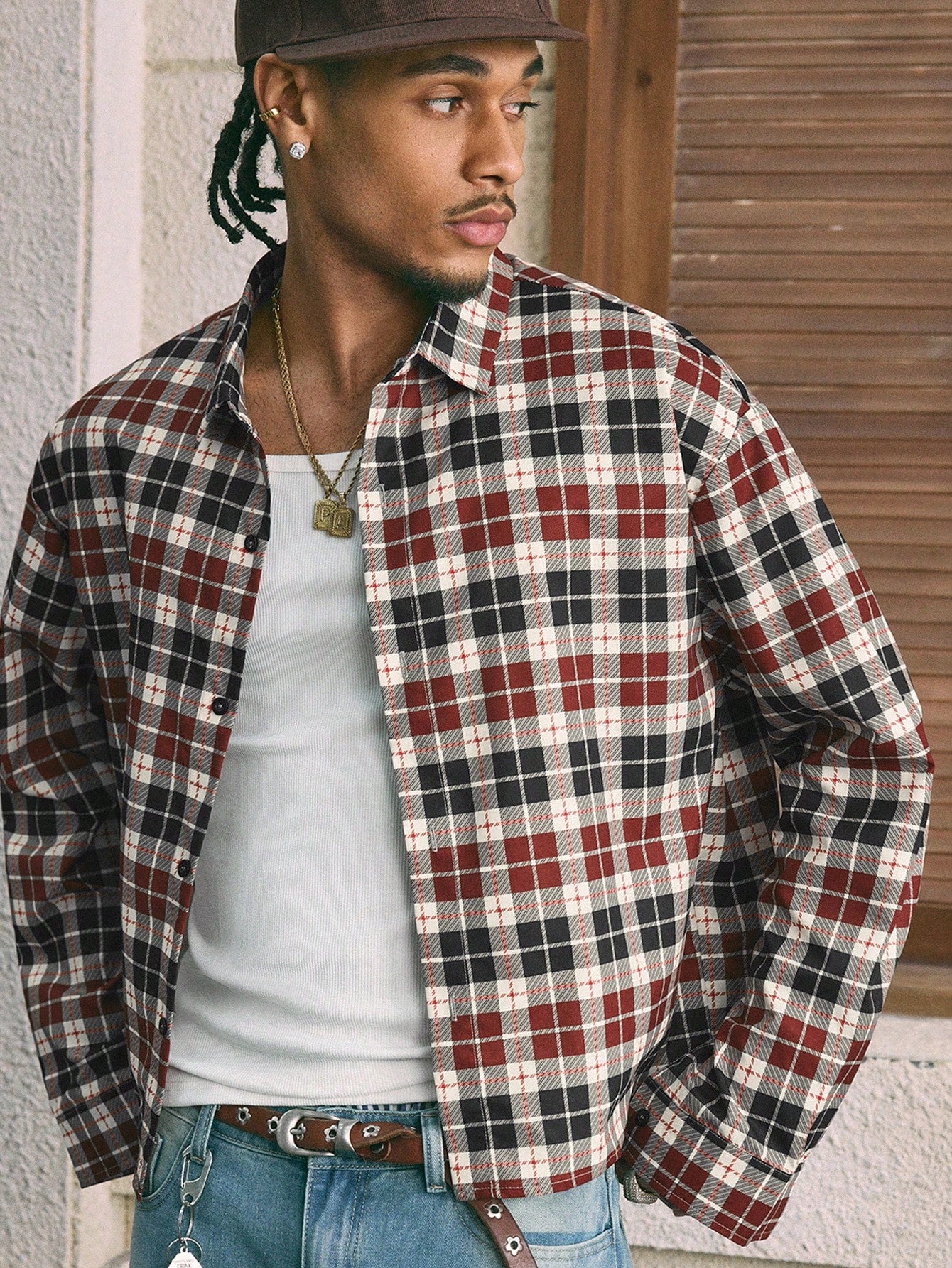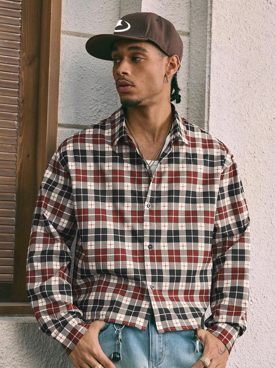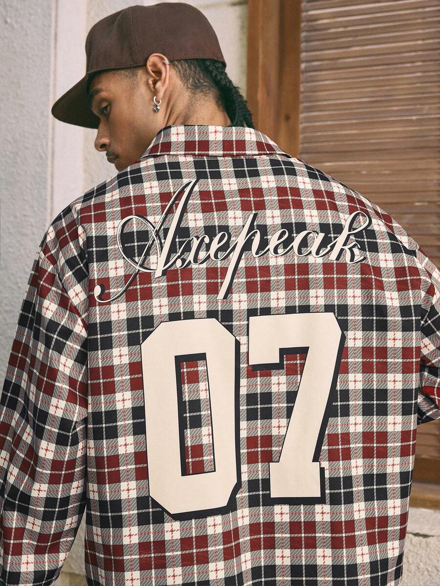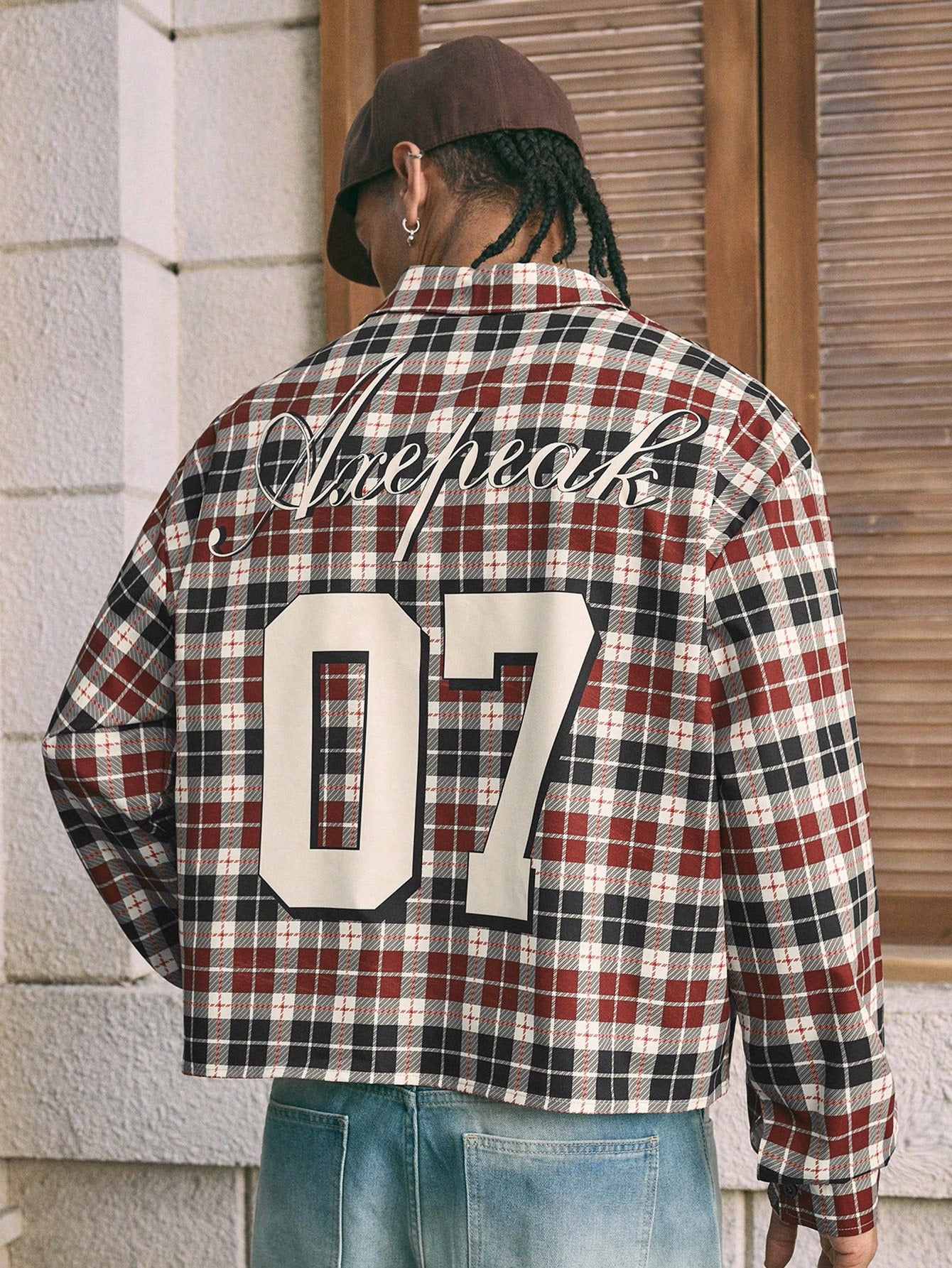 AXEPEAK Men's Drop Shoulder Plaid Casual Button-Front Shirt With Letter Graphic, Versatile