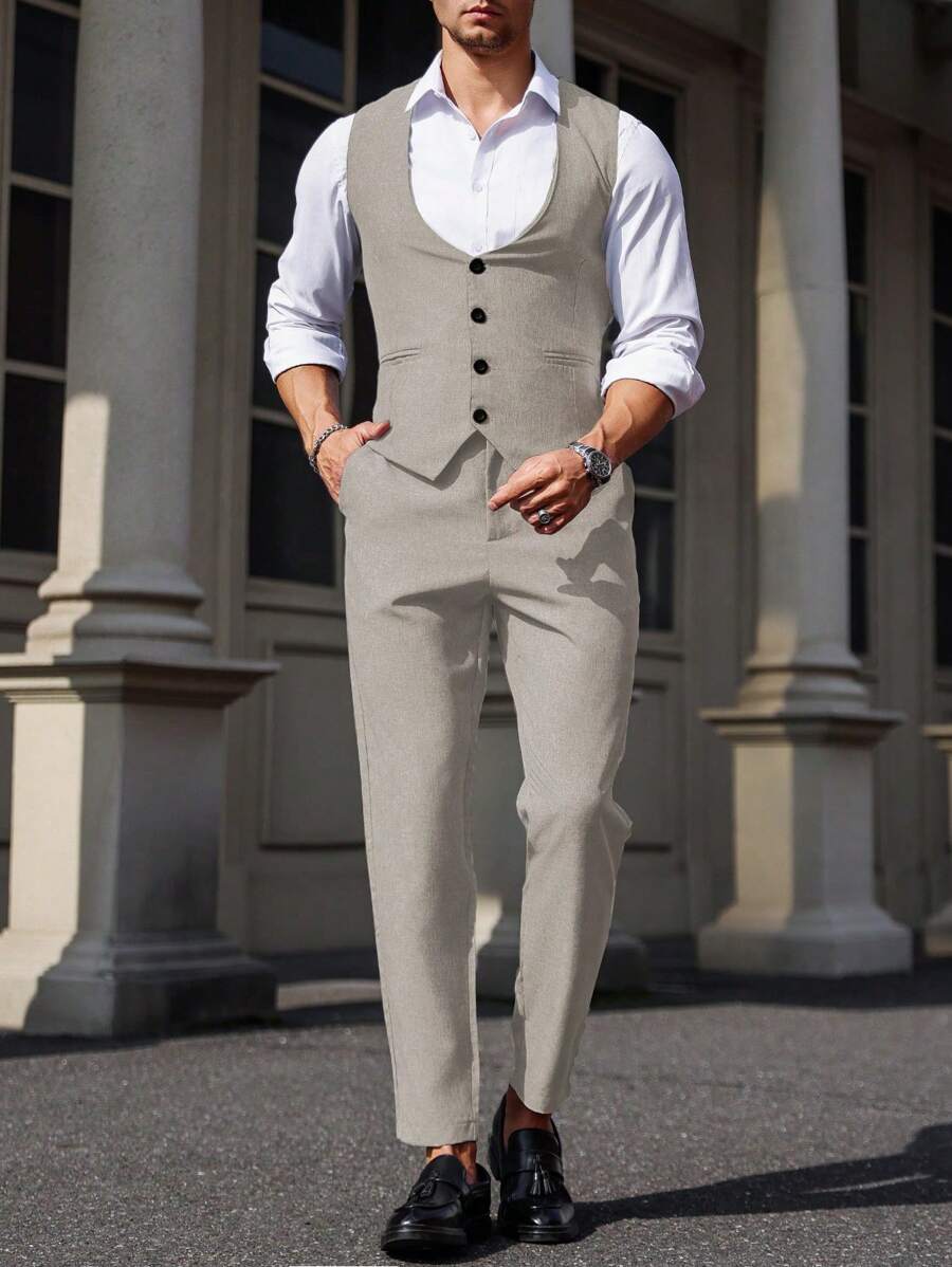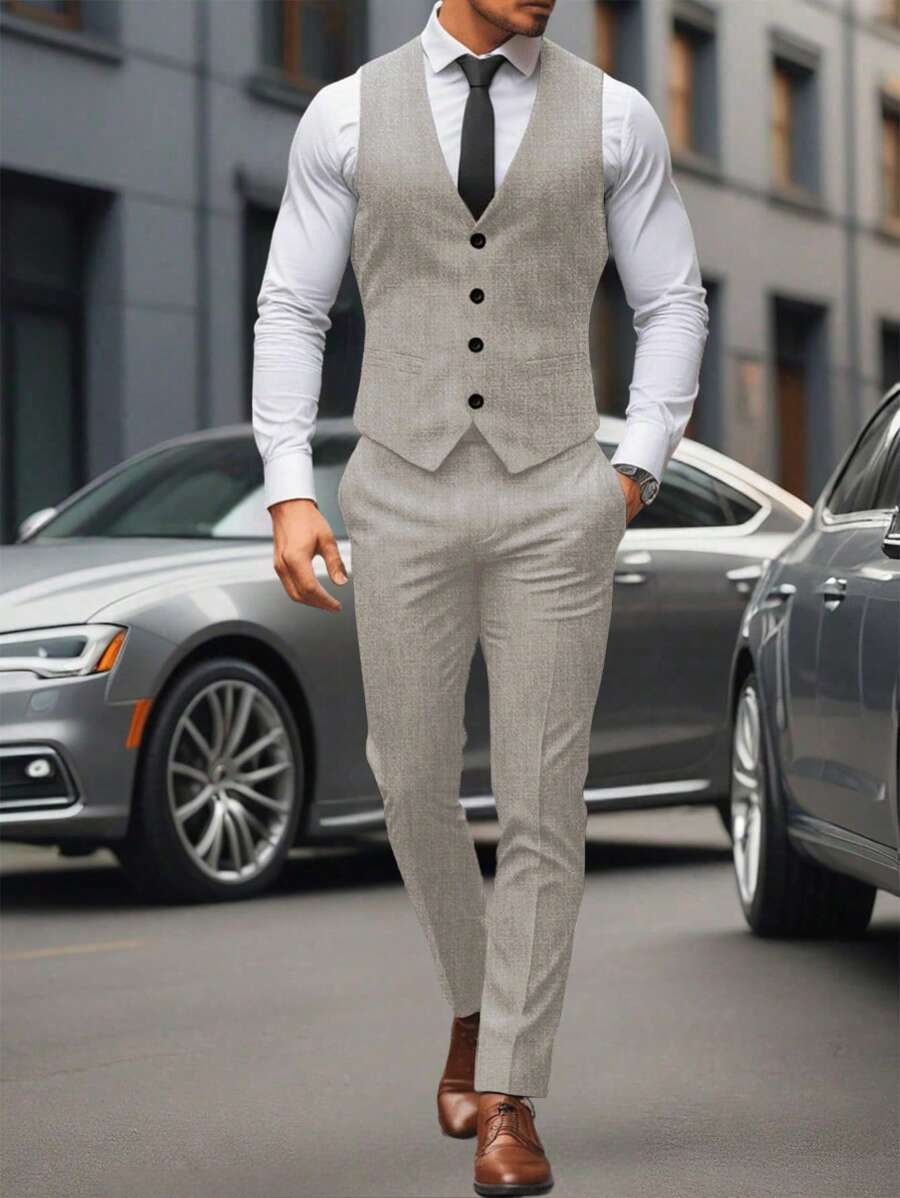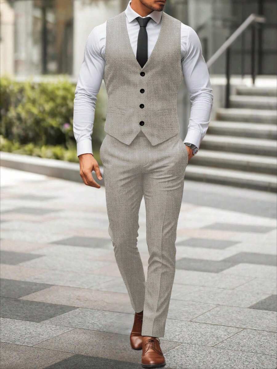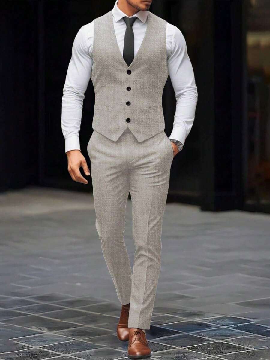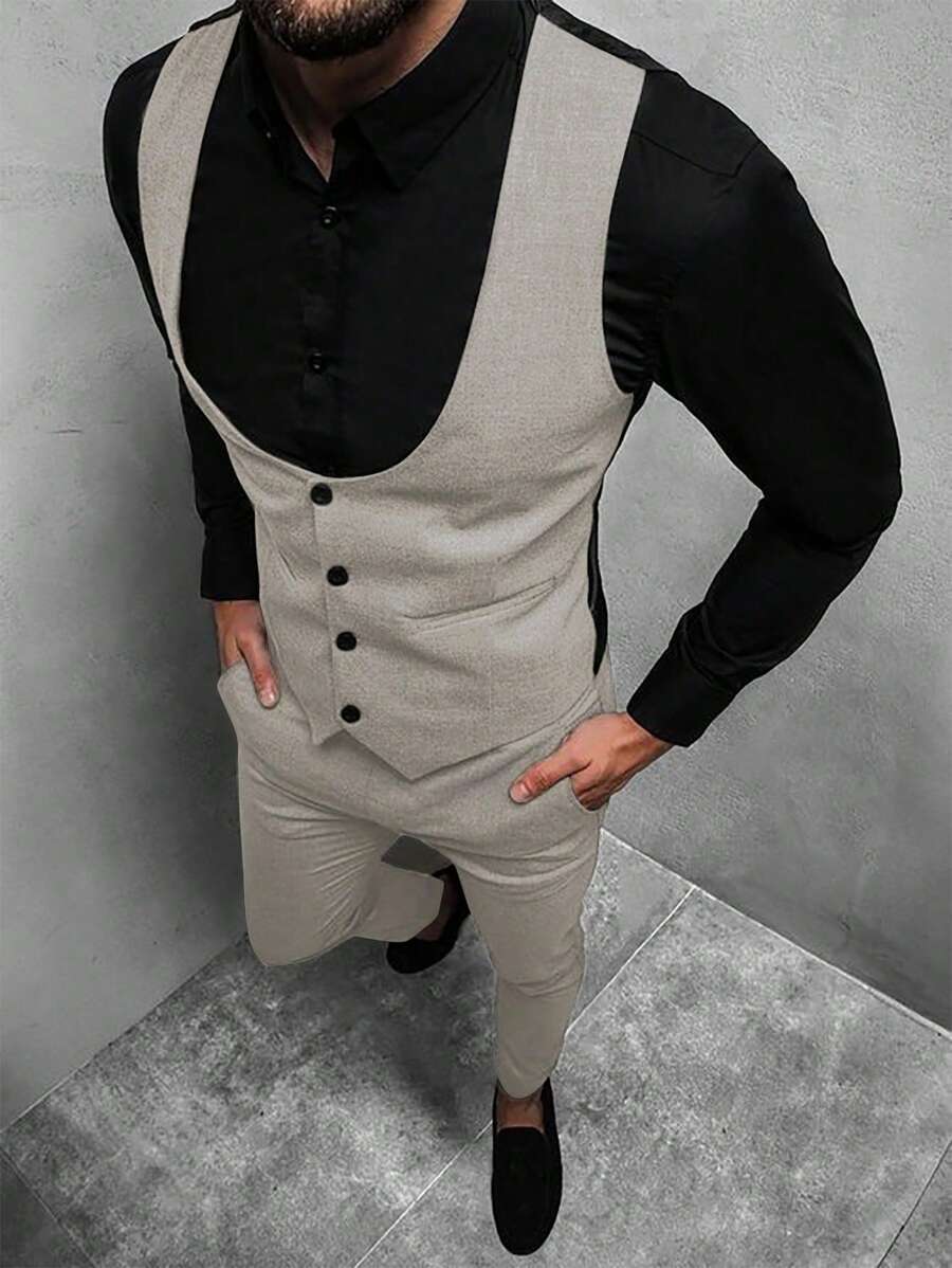 Manfinity Mode Men's Solid Color Sleeveless Top And Pants Suit Set, Men Beige Suit, Men Dress Vest, Men Suit Vest, Men Elegant Outfit