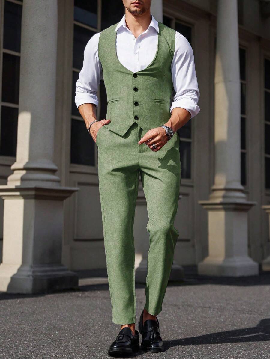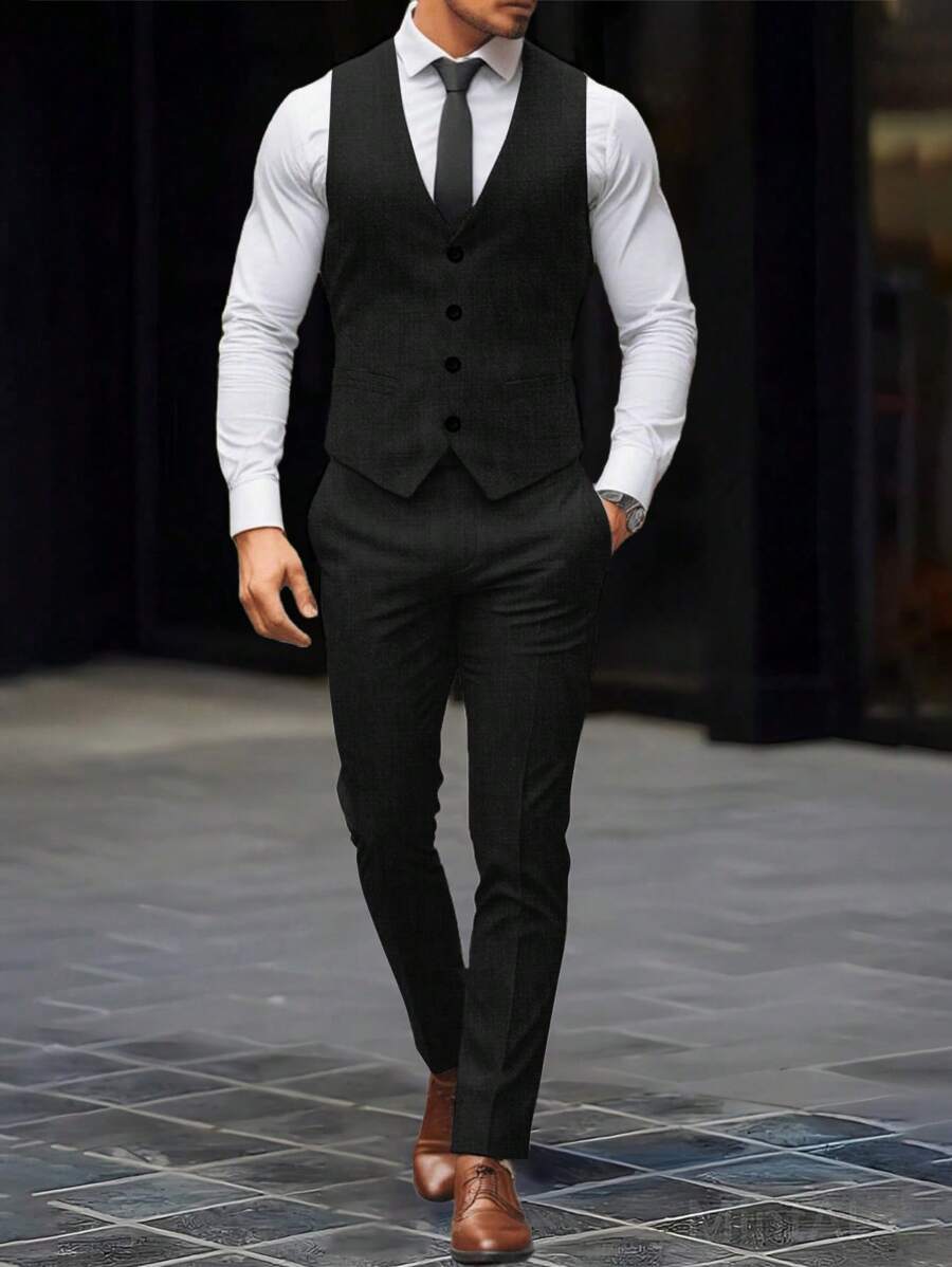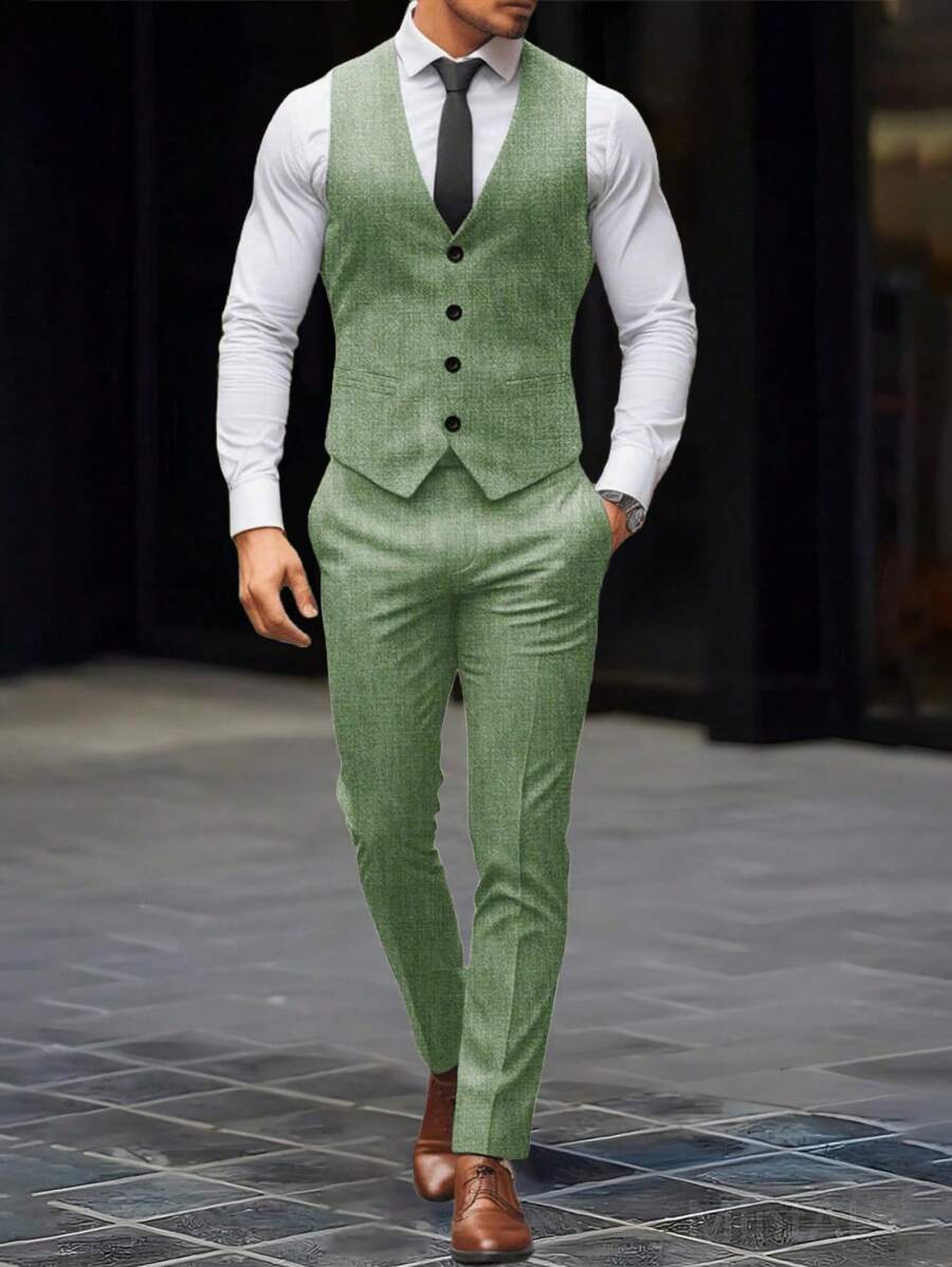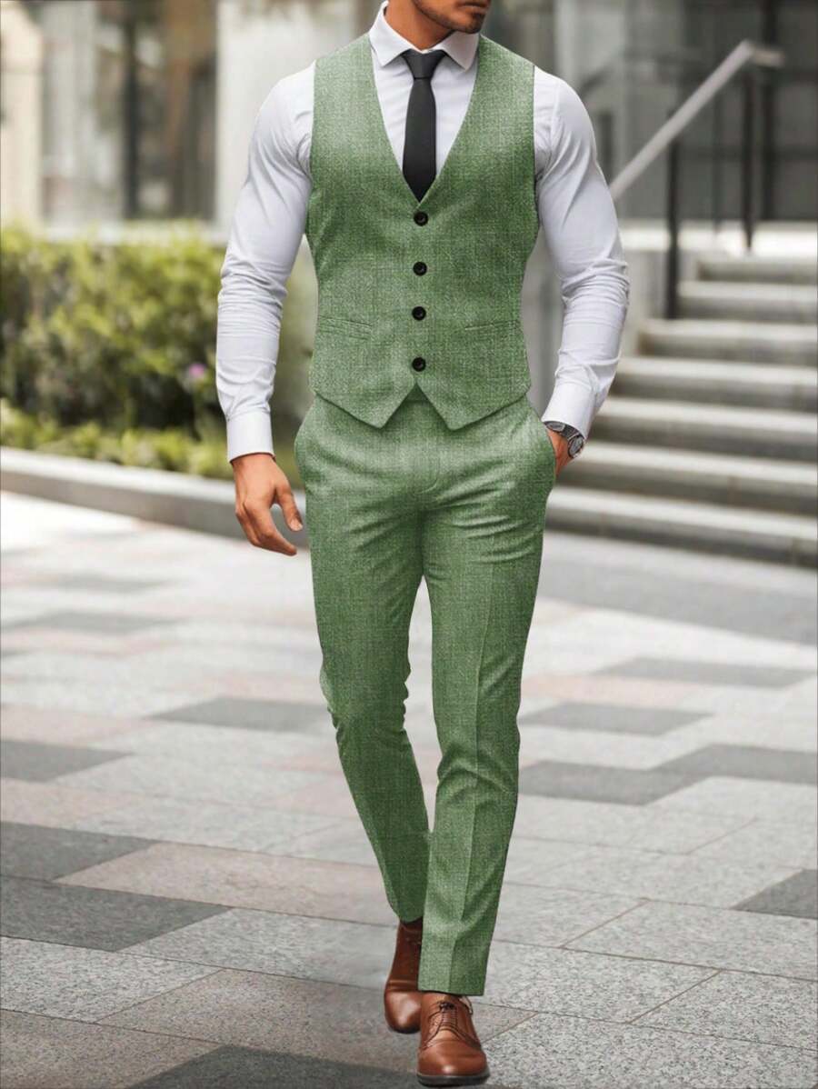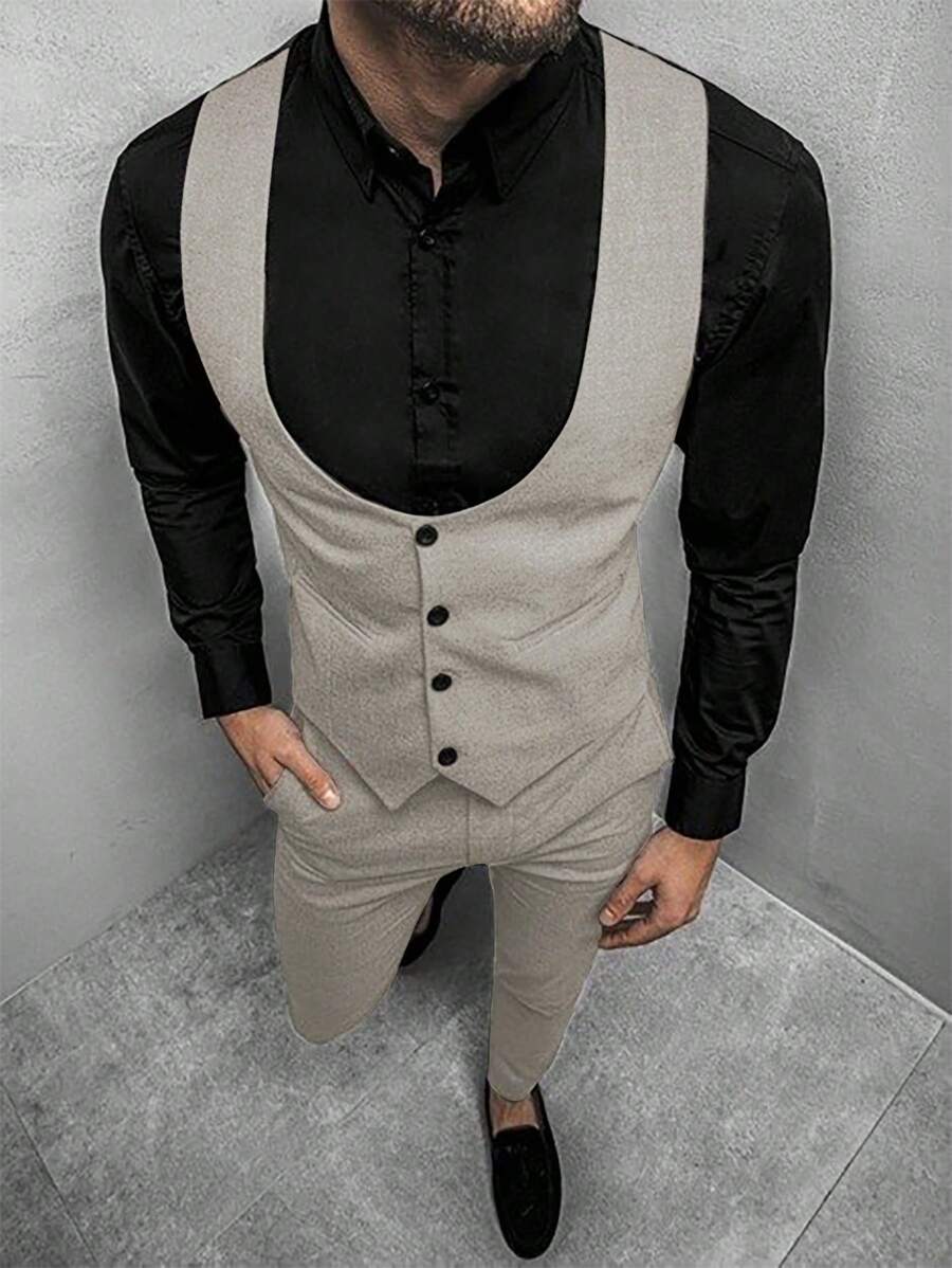 Manfinity Mode Men's Solid Color Sleeveless Top And Pants Suit Set, Men Beige Suit, Men Dress Vest, Men Suit Vest, Men Elegant Outfit