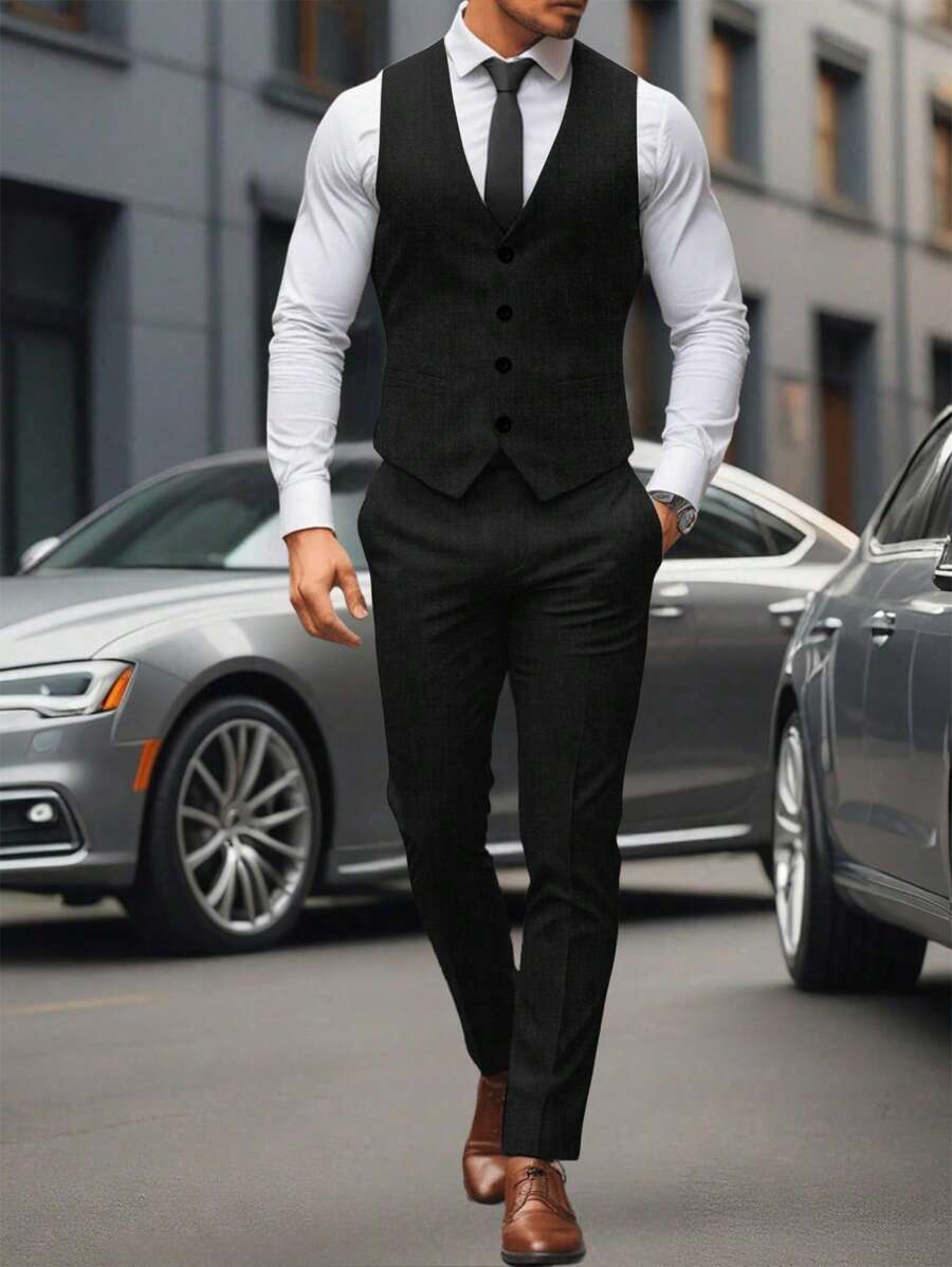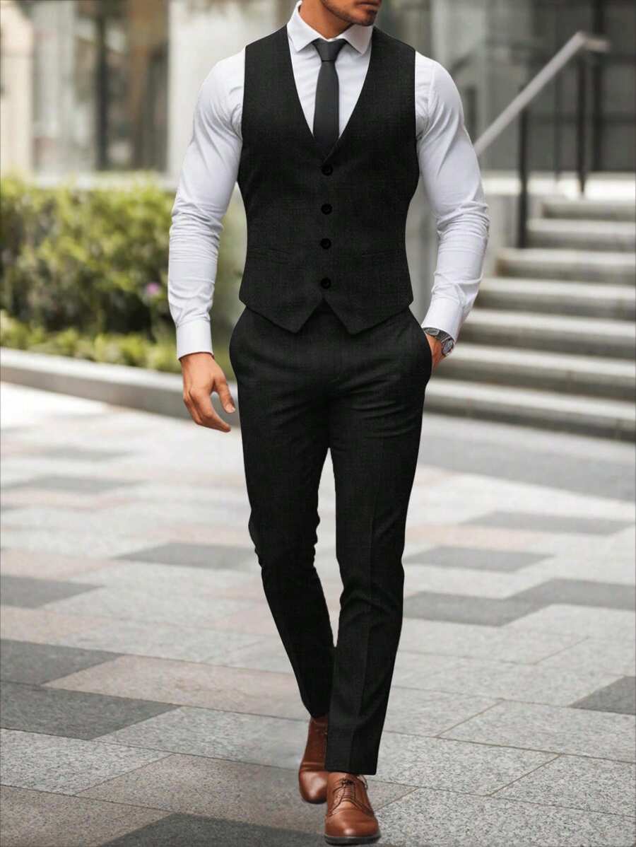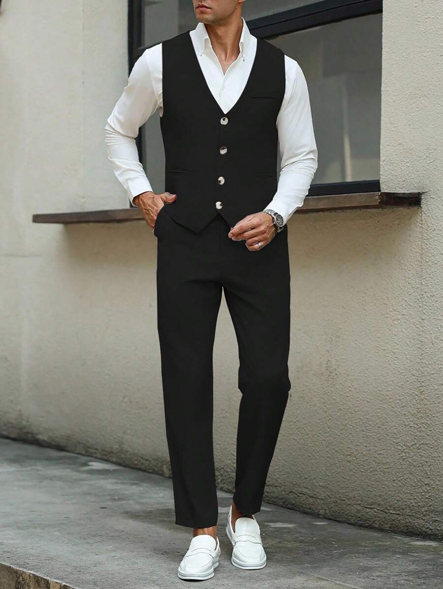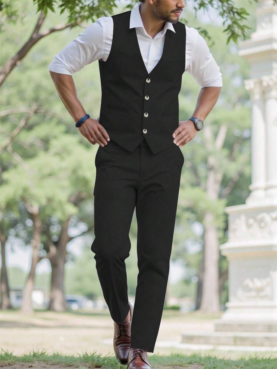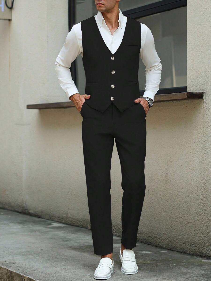 Manfinity Mode Men's Solid Color Sleeveless Top And Pants Suit Set, Men Beige Suit, Men Dress Vest, Men Suit Vest, Men Elegant Outfit