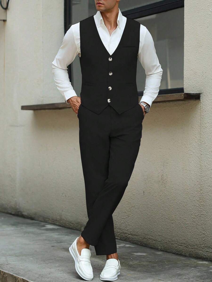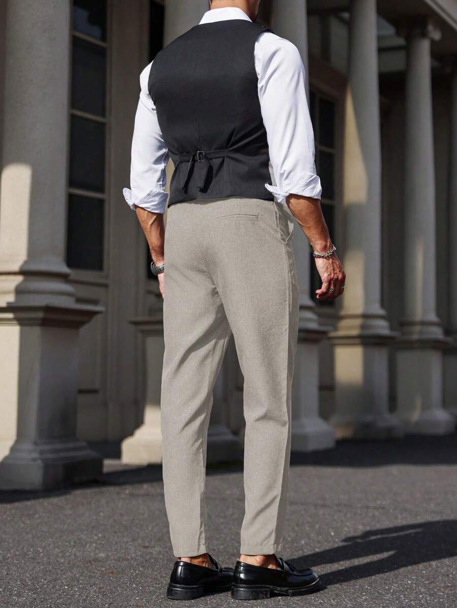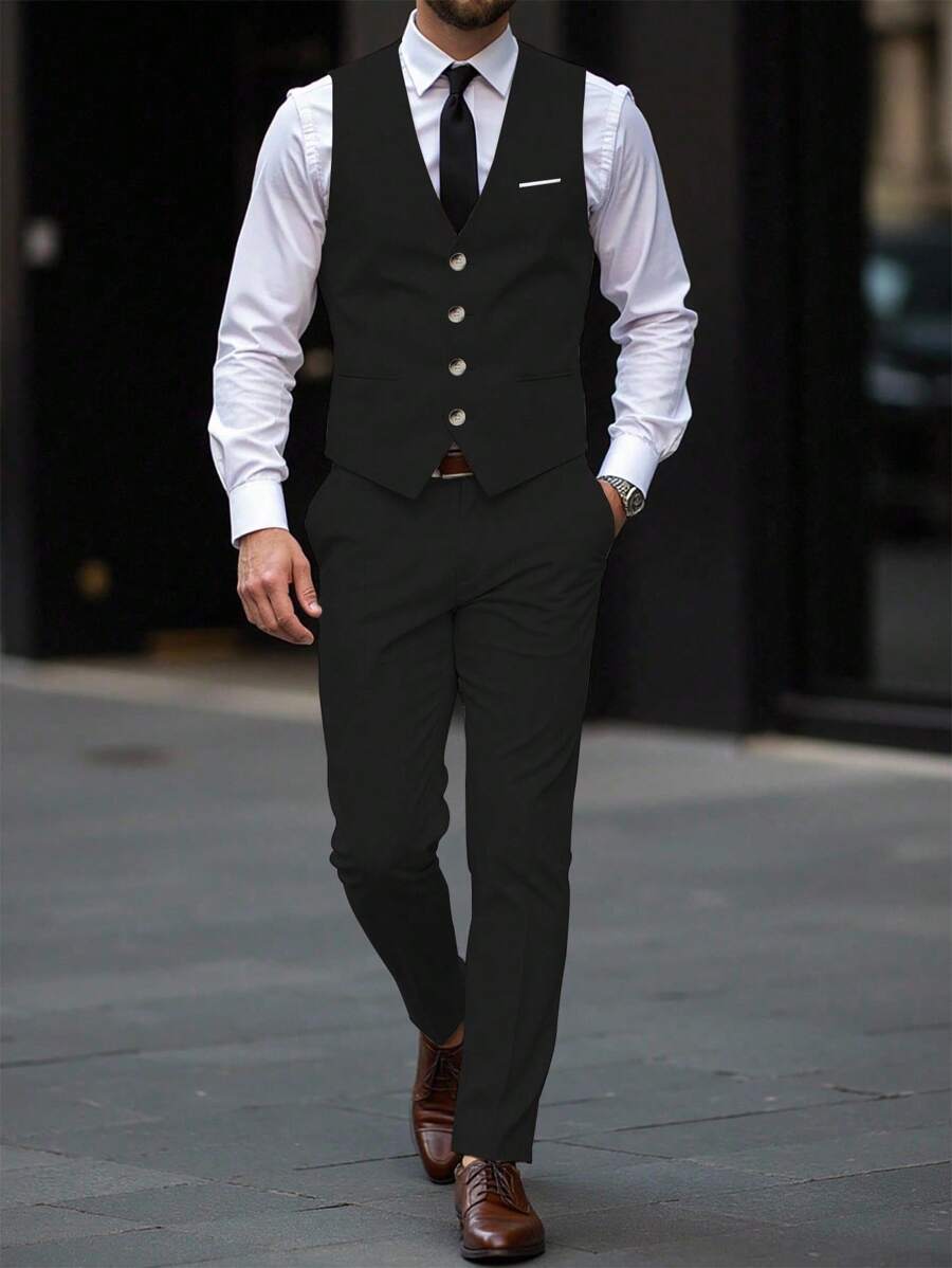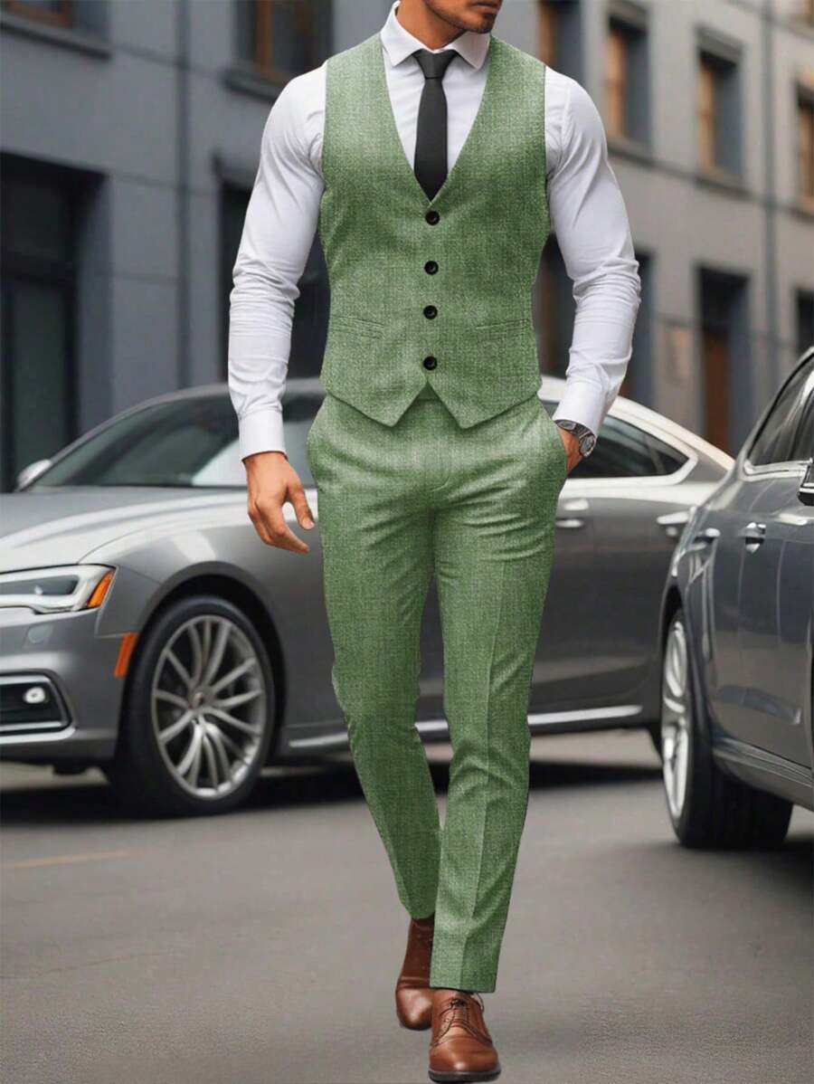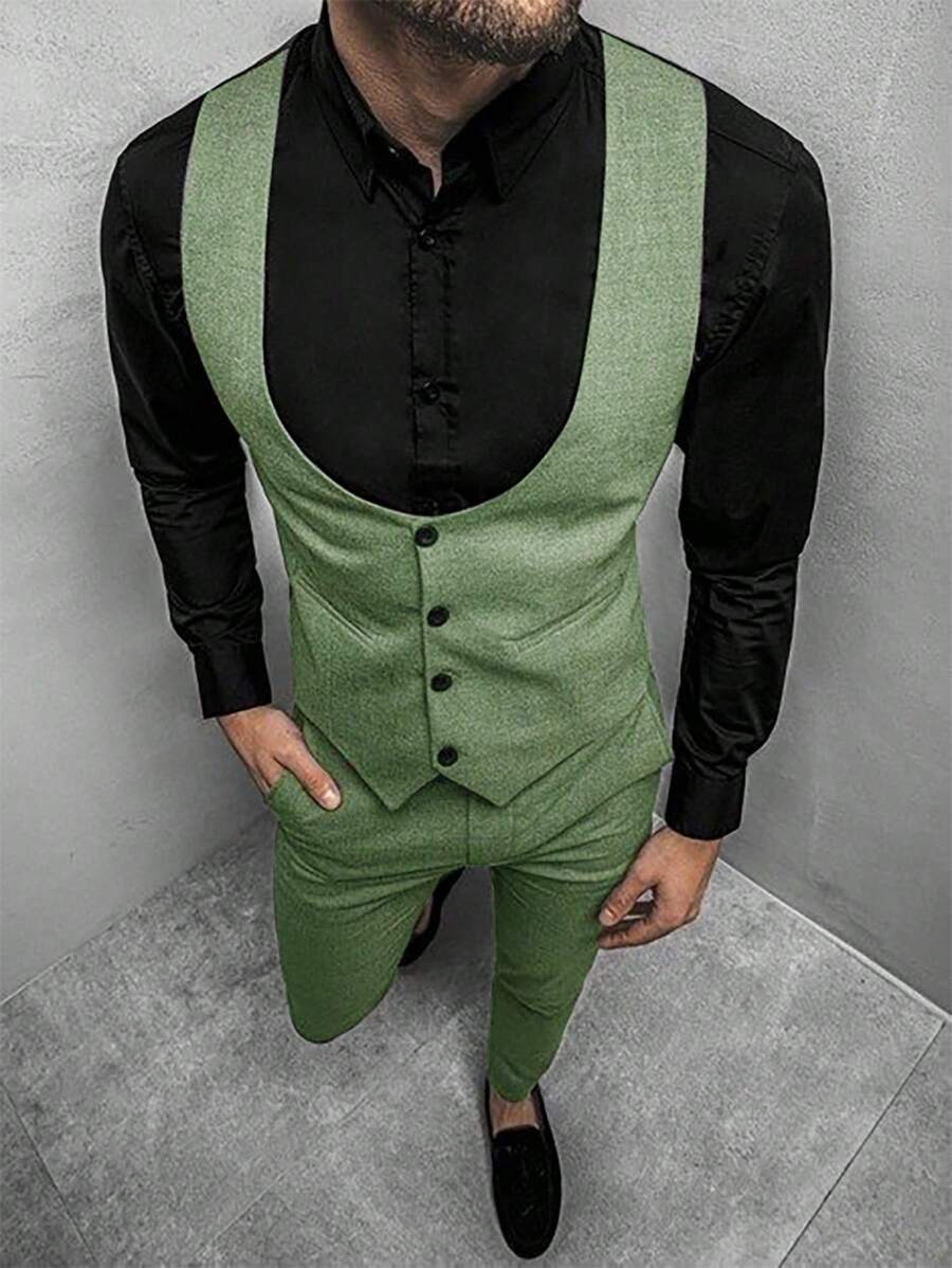 Manfinity Mode Men's Solid Color Sleeveless Top And Pants Suit Set, Men Beige Suit, Men Dress Vest, Men Suit Vest, Men Elegant Outfit