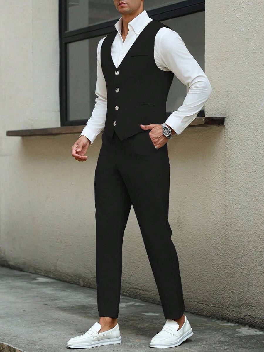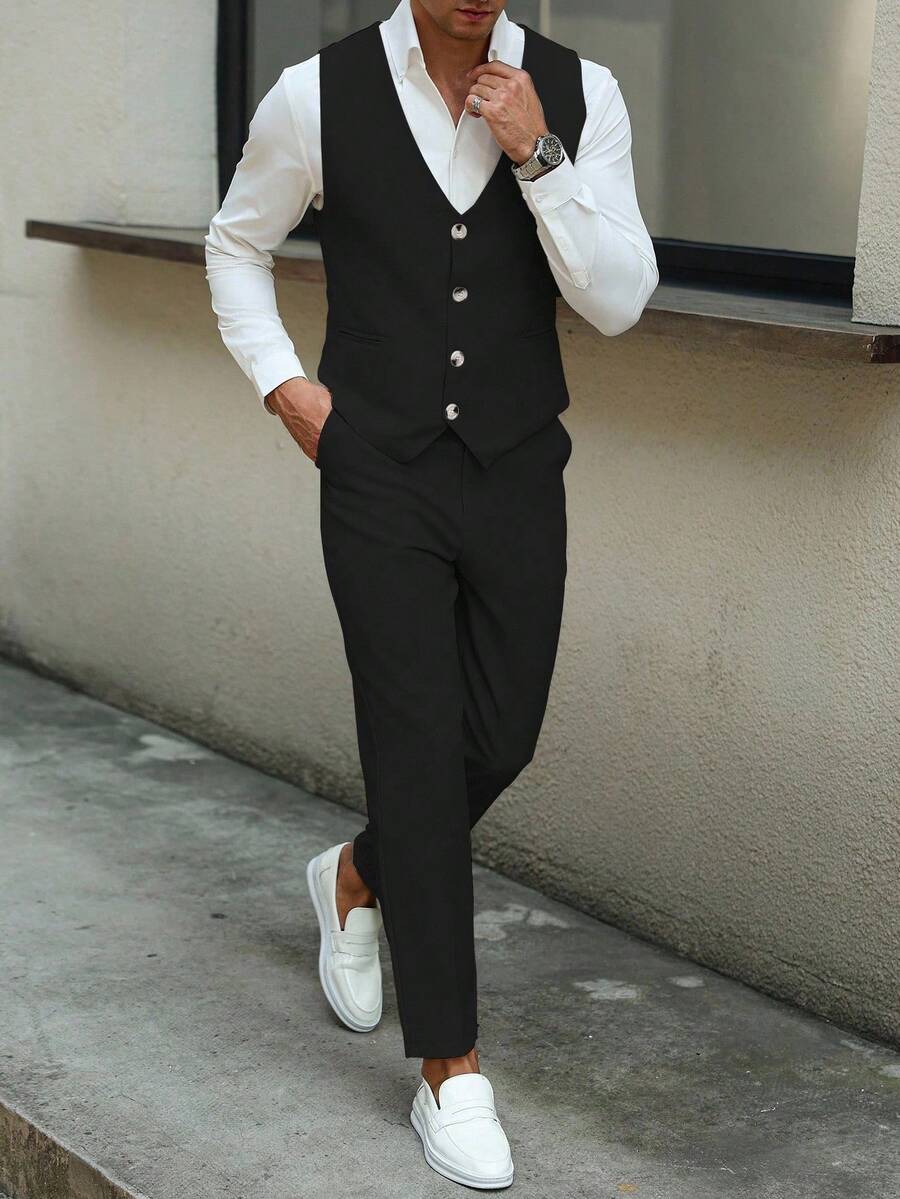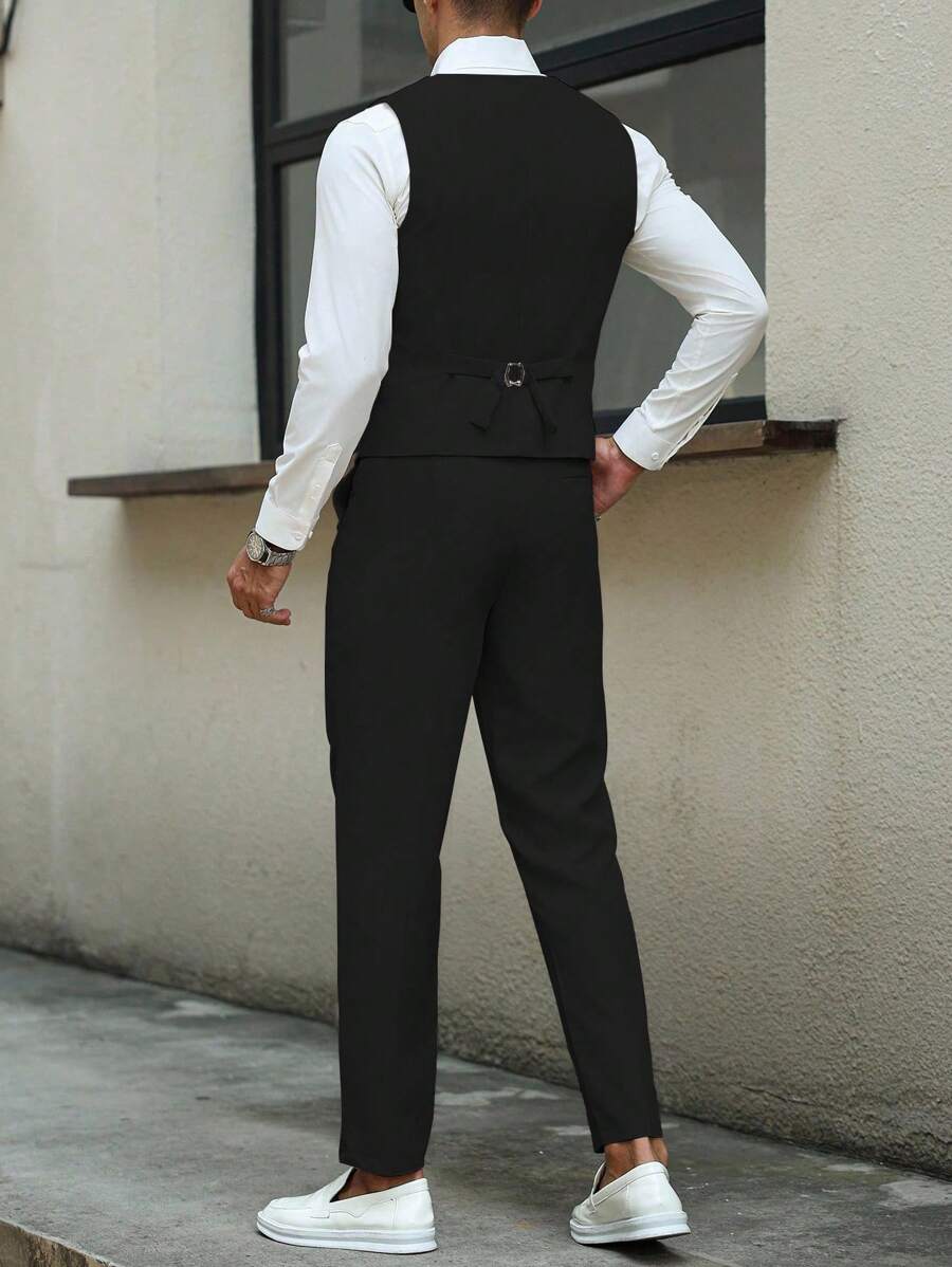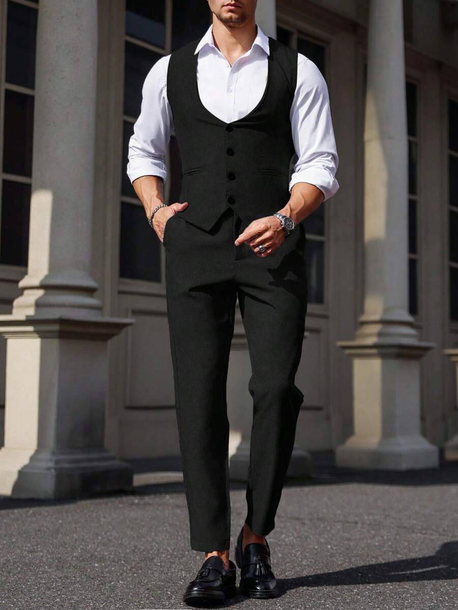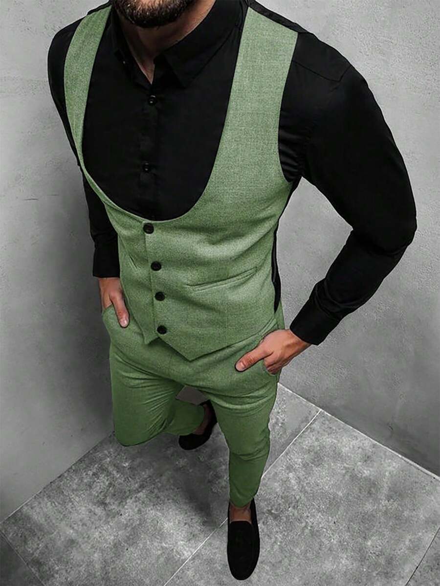 Manfinity Mode Men's Solid Color Sleeveless Top And Pants Suit Set, Men Beige Suit, Men Dress Vest, Men Suit Vest, Men Elegant Outfit