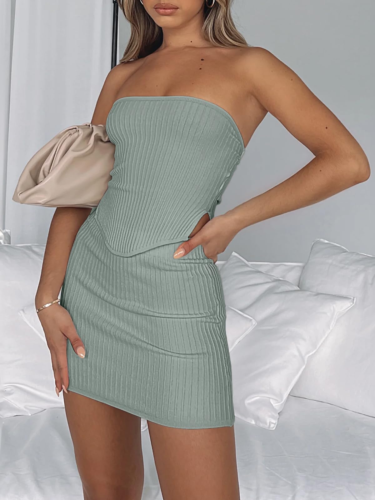 • Design with ribbed knit, strapless, sleeveless, high waisted, tube top and mini skirt.
